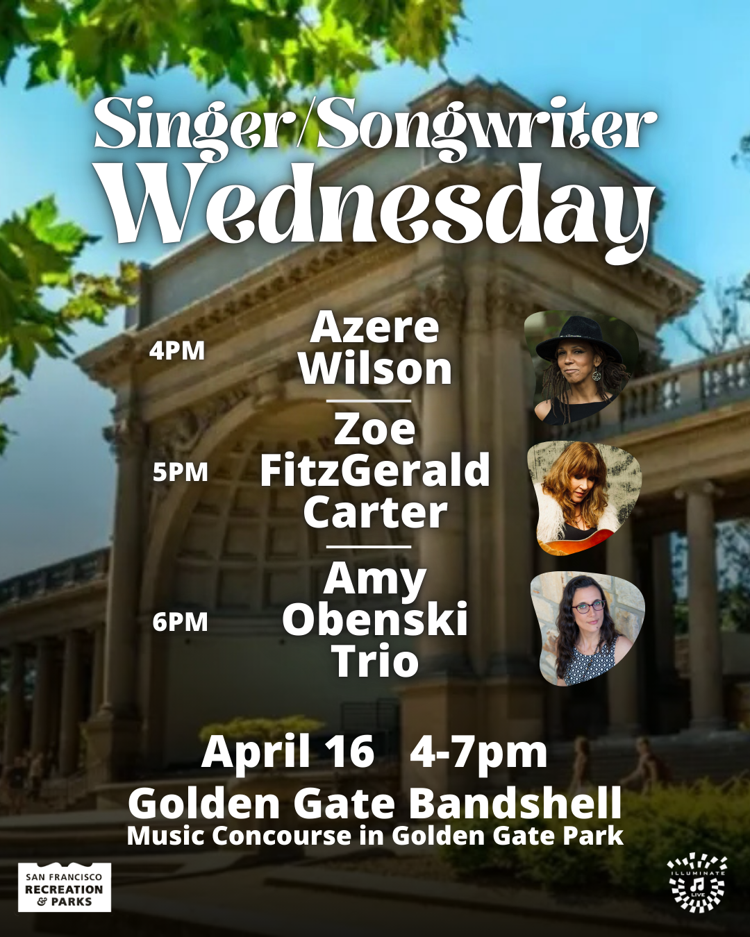 March 20, 2024Enjoy a mid-week musical break with Singer/Songwriter Wednesday at the Golden Gate Bandshell! Set Times: 4:00 pm – Amy Obenski5:00 pm – Sara Rodenburg6:00 pm – Michelle Lambert