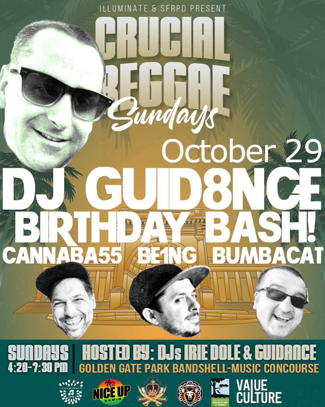 October 29, 2023Join us at Golden Gate Bandshell for a special Crucial Reggae Sunday: DJ Guid8nce Birthday Bash/pre-Halloween get down! (costumes optional) Set times:4:20pm – Irie Dole & DJ Guid8nce5:30pm – Special Guests: Canaba55, Be1ng, & Bumbacat