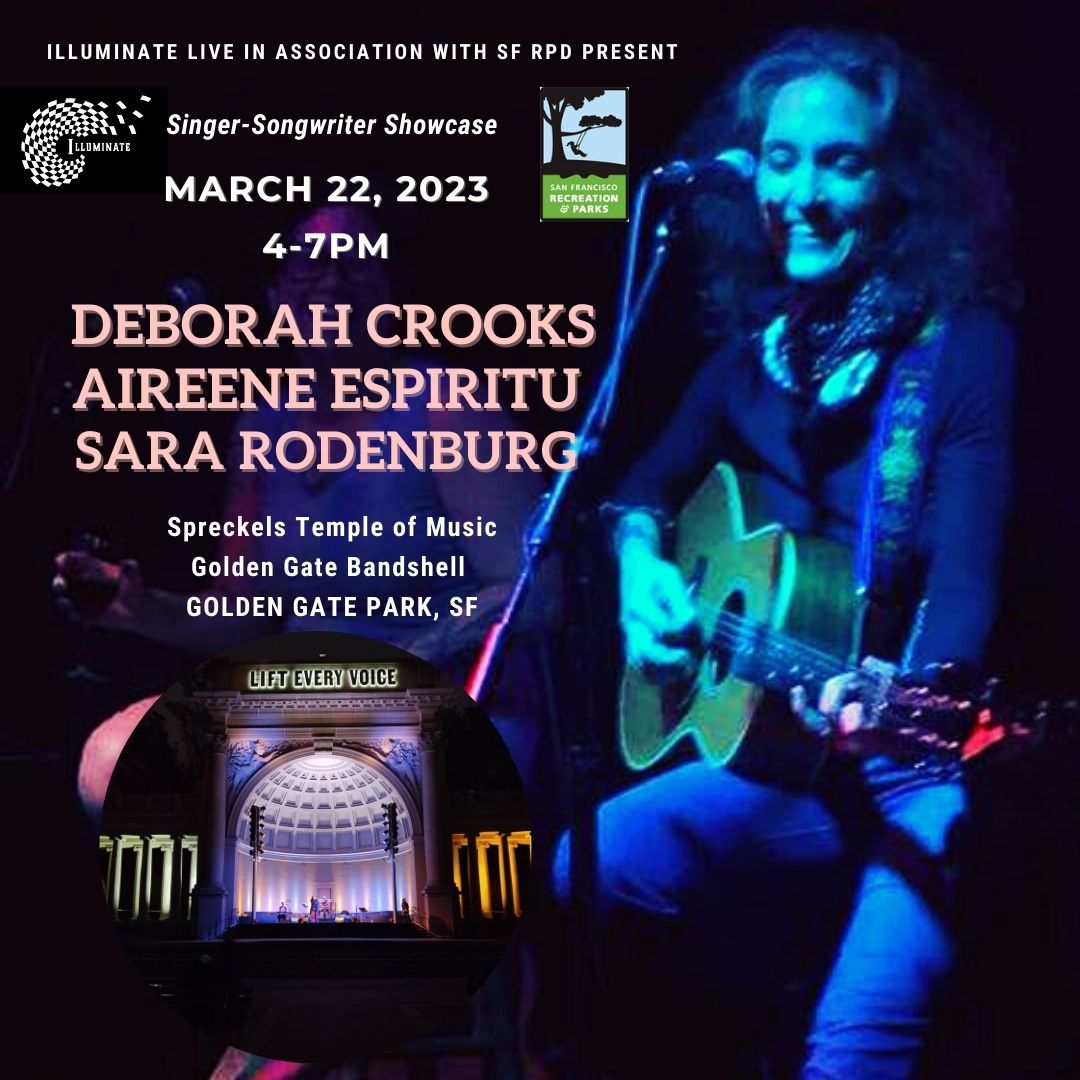 March 22, 2023Join us at Golden Gate Bandshell for the sixth installment of Illuminate Live’s celebration of International Women’s Month, with an all-female singer/songwriter lineup. Set times:4:00 pm – Sara Rodenburg5:00 pm – Aireene Espiritu6:00 pm – Deborah Crooks