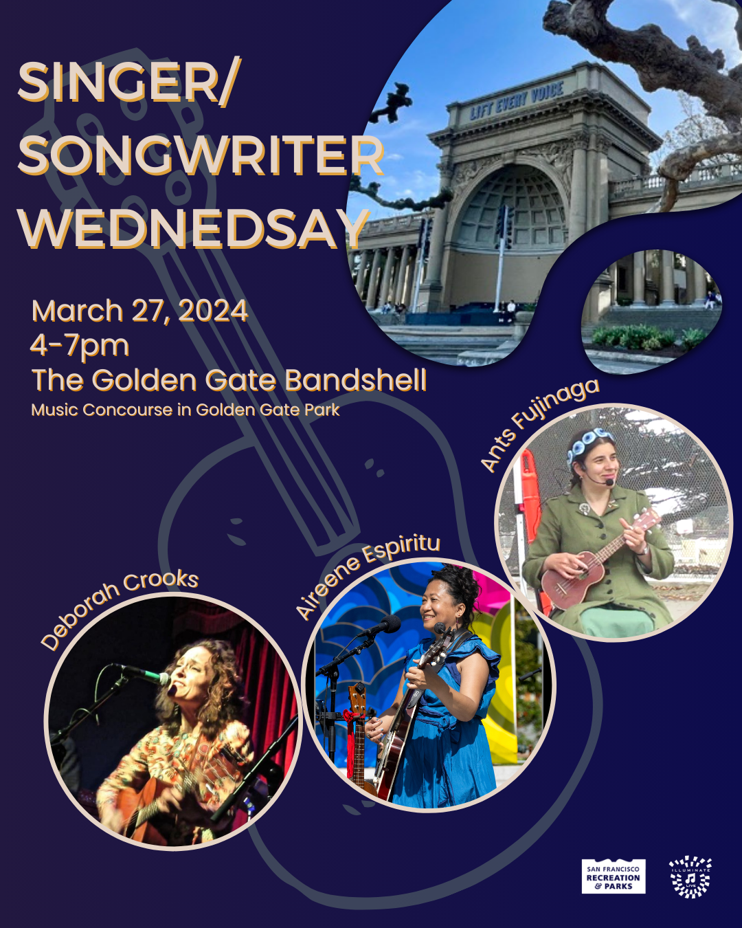 March 27, 2024Enjoy a mid-week musical break with Singer/Songwriter Wednesday at the Golden Gate Bandshell! Set Times: 4:00 pm – Ants Fujinaga5:00 pm – Aireene Espiritu6:00 pm – Deborah Crooks