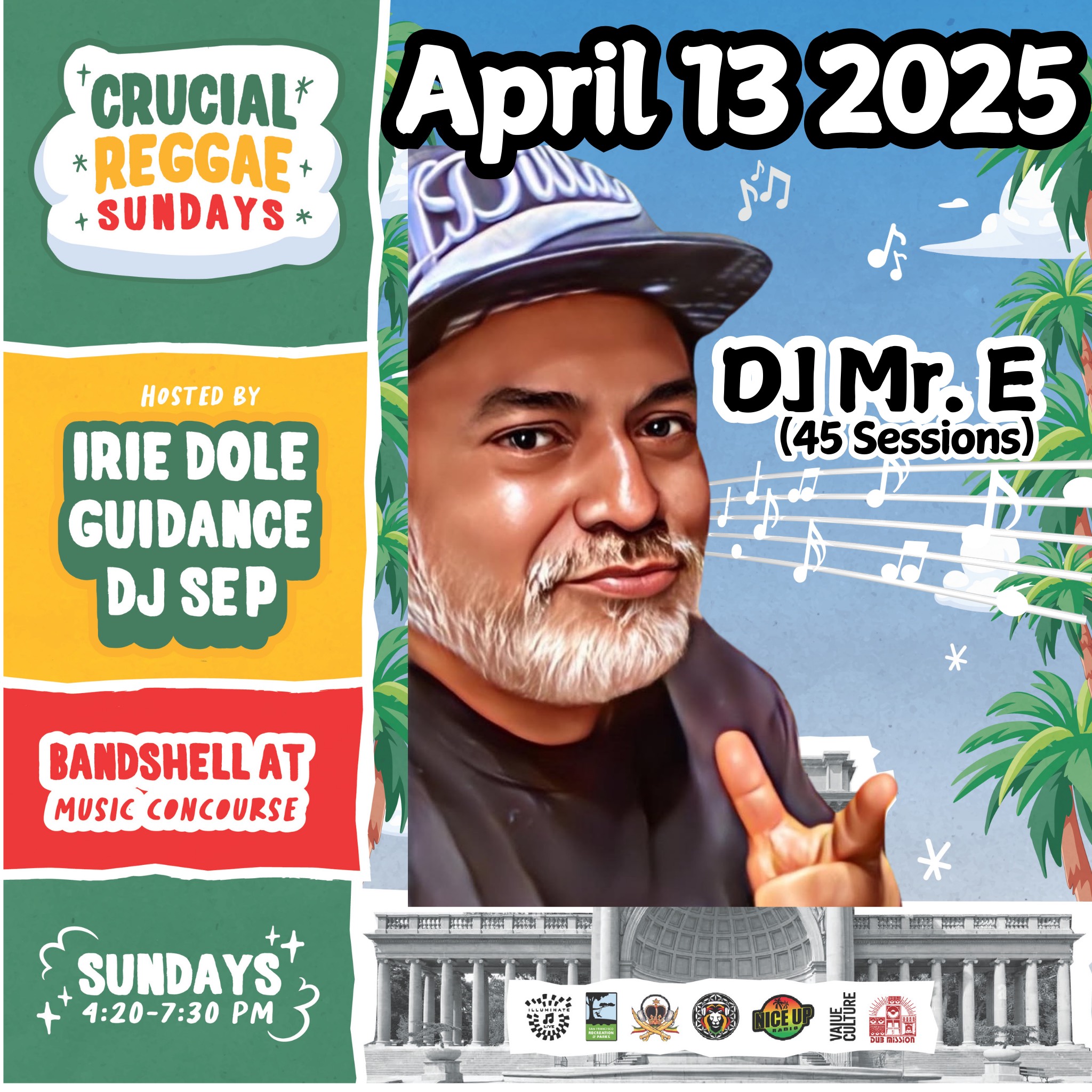 April 13, 2025Close out the weekend dancing in the park at Crucial Reggae Sundays. Hosts:Irie Dole, DJ Guidance, & DJ SepSpecial Guests:DJ Mr. E (45 Sessions)