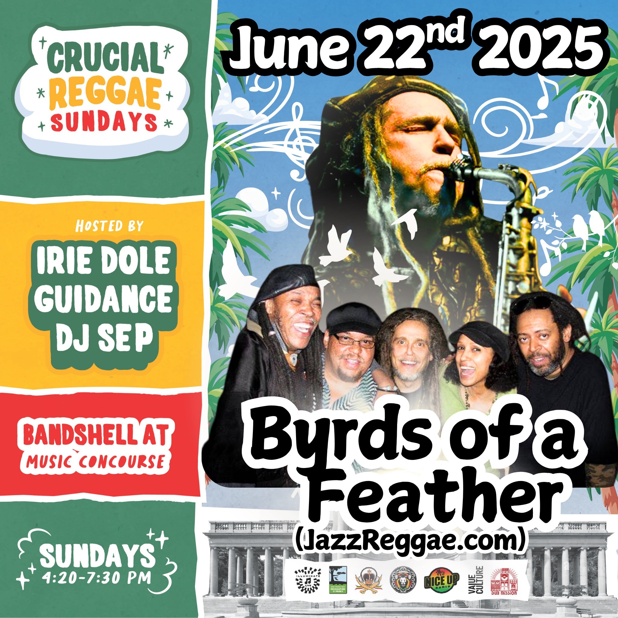 June 22, 2025Close out the weekend dancing in the park at Crucial Reggae Sundays. Hosts:Irie Dole, DJ Guidance, & DJ SepSpecial Guests:Byrds of a Feather (LIVE BAND SHOW!)