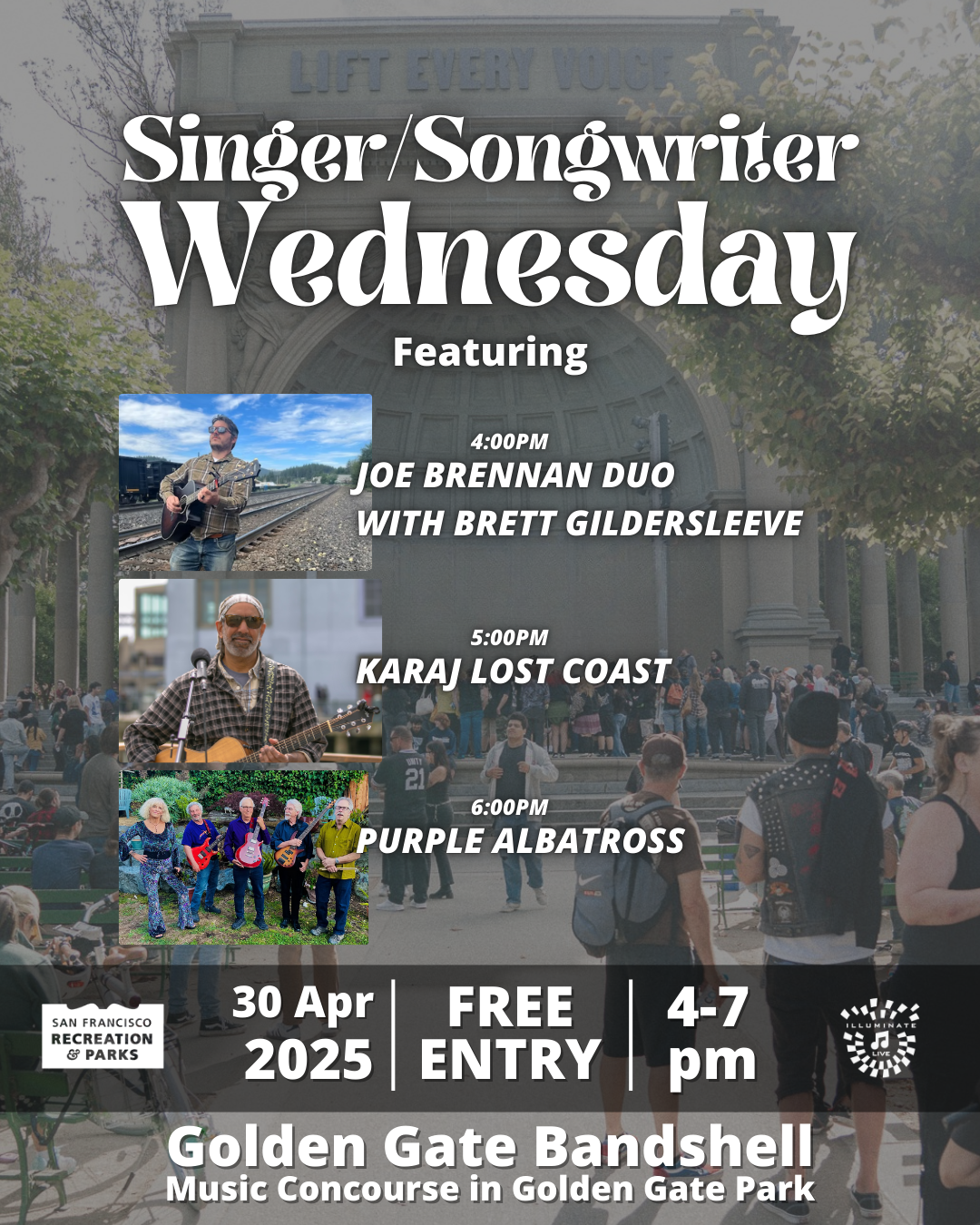 April 30, 2025Pack some snacks, your favorite drinks, and grab your friends! It’s time to take a mid-week musical break and enjoy free live music from local San Francisco musicians. Set Times: 4:00 – Joe Brennan duo with Brett Gildersleeve5:00 – karaj lost coast6:00 – Purple Albatross