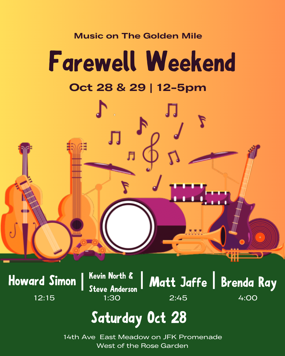 October 28, 2023The Golden Mile Beer & Wine Garden has closed for the season, but the music isn’t through yet! Come out the the Garden and enjoy one final weekend free live music on The Golden Mile! Located on 14th Ave East Meadow on JFK Promenade, west of the Rose Garden. Feel Free to bring your own […]