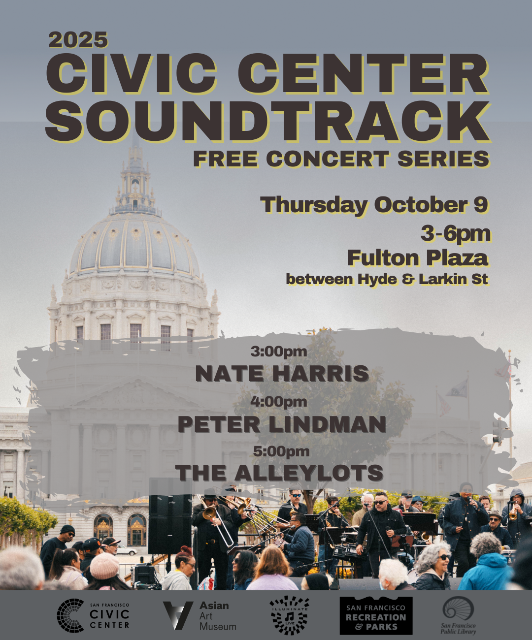 October 9, 2025Take a long lunch and enjoy free live local music in downtown San Francisco. Set Times:3:00 pm – Nate Harris4:00 pm – Peter Lindman5:00 pm – The Alleylots