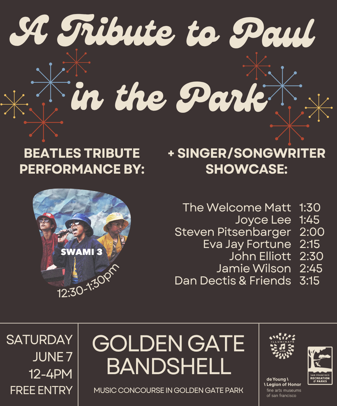 June 7, 2025Join us in commemorating the final day of the exhibit: Paul McCartney Photographs 1963–64: Eyes of the Storm Set Times12:00pm – Beatles Tribute by Swami 3Singer/Songwriter Showcase:1:30 – The Welcome Matt1:45 – Joyce Lee2:00 – Steven Pitsenbarger2:15 – Eva Jay Fortune2:30 – John Elliott2:45 – Jamie Wilson3:15 – Dan Dectis & Friends