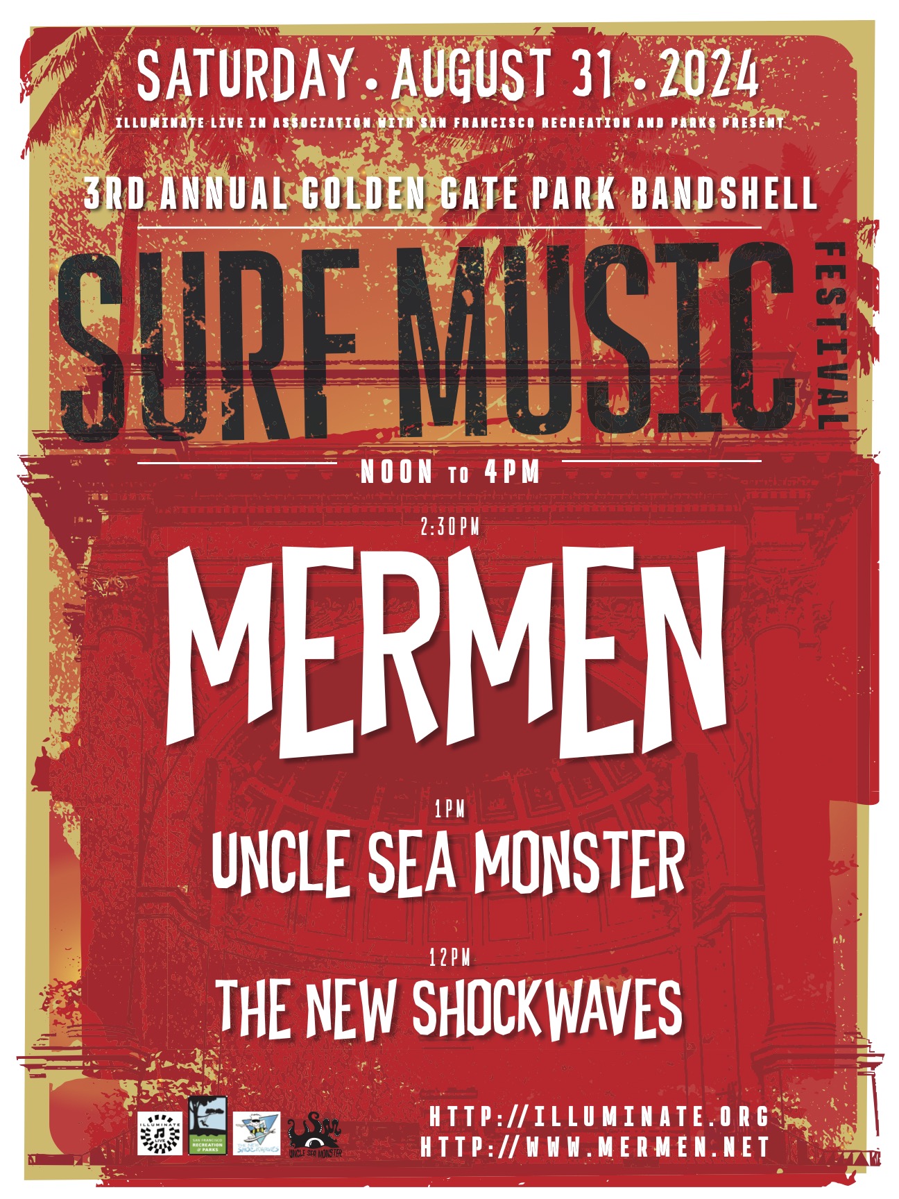 August 31, 2024Join us at The Golden Gate Bandshell for the 3rd annual Surf Music Festival featuring: Set Times:12:00pm – The New Shockwaves1:00pm – Uncle Sea Monster2:30pm – The Mermen