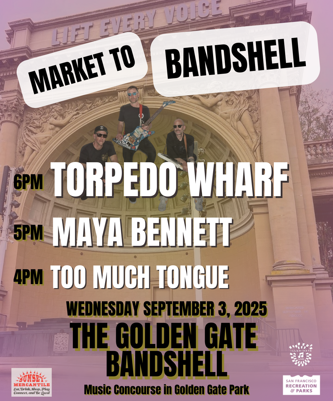 September 3, 2025Enjoy a mid-week musical break at Market to Bandshell, a free live concert that features up & coming talent from the Sunset Mercantile Farmers Market, featured on the Golden Gate Bandshell stage! Set Times: 4:00 – Too Much Tongue5:00 – Maya Bennett6:00 – Torpedo Wharf