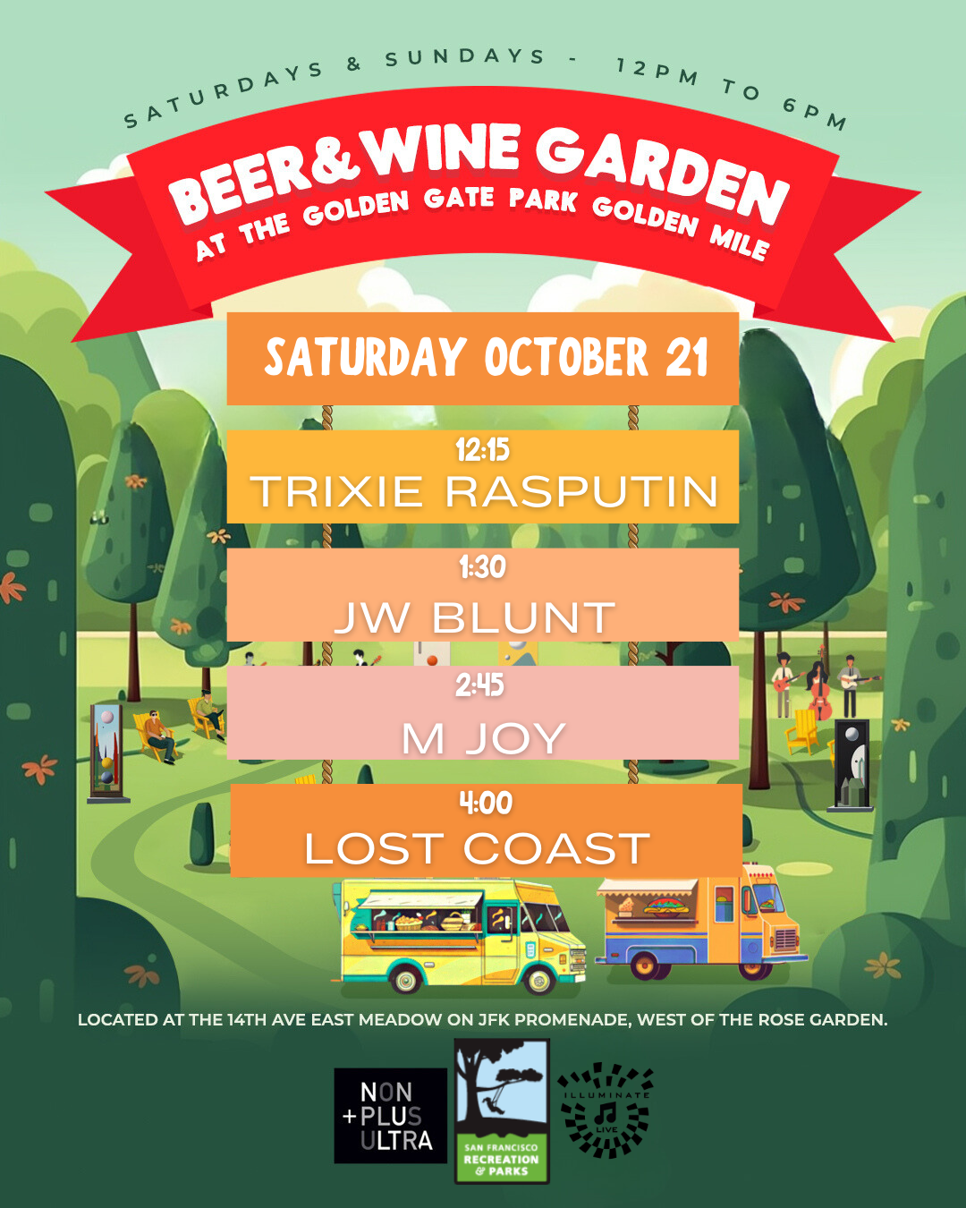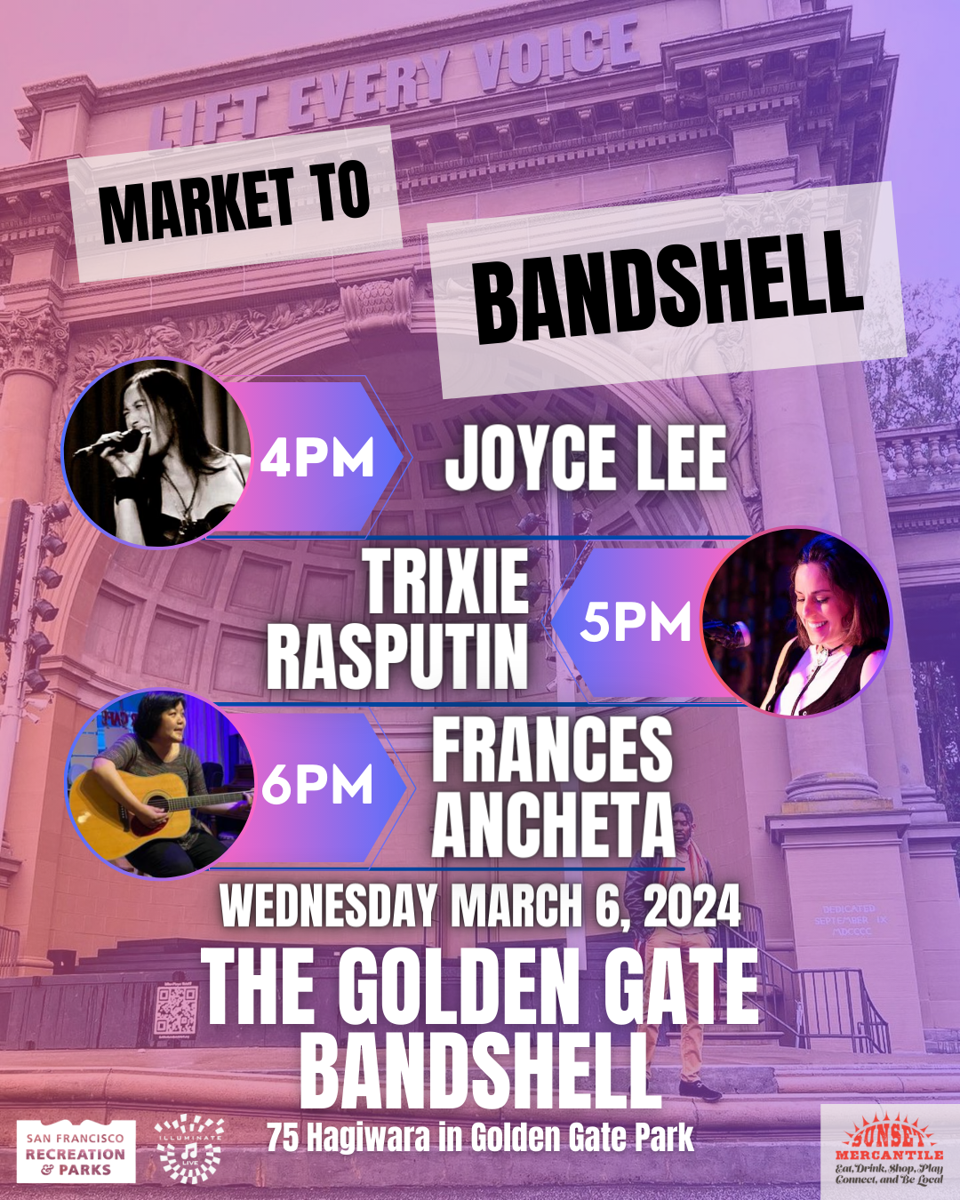 March 6, 2024The first Market to Bandshell of the 2024 season has arrived! Enjoy a mid-week musical break with up & coming talent from the Sunset Mercantile Farmers Market, featured on the Golden Gate Bandshell stage! Set Times: 4:00 pm – Joyce Lee5:00 pm – Trixie Rasputin6:00 pm – Frances Ancheta Becker