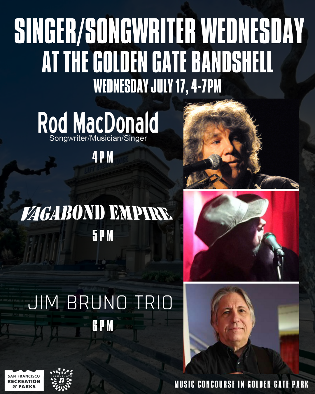 September 20, 2023Join us at Golden Gate Bandshell to enjoy the music of local singer/songwriters. Set Times:4:00 – 5:00pm – Pickleweed Paul5:00 – 6:00pm – Vagabond Empire6:00 – 7:00pm – Keepers of Humanity
