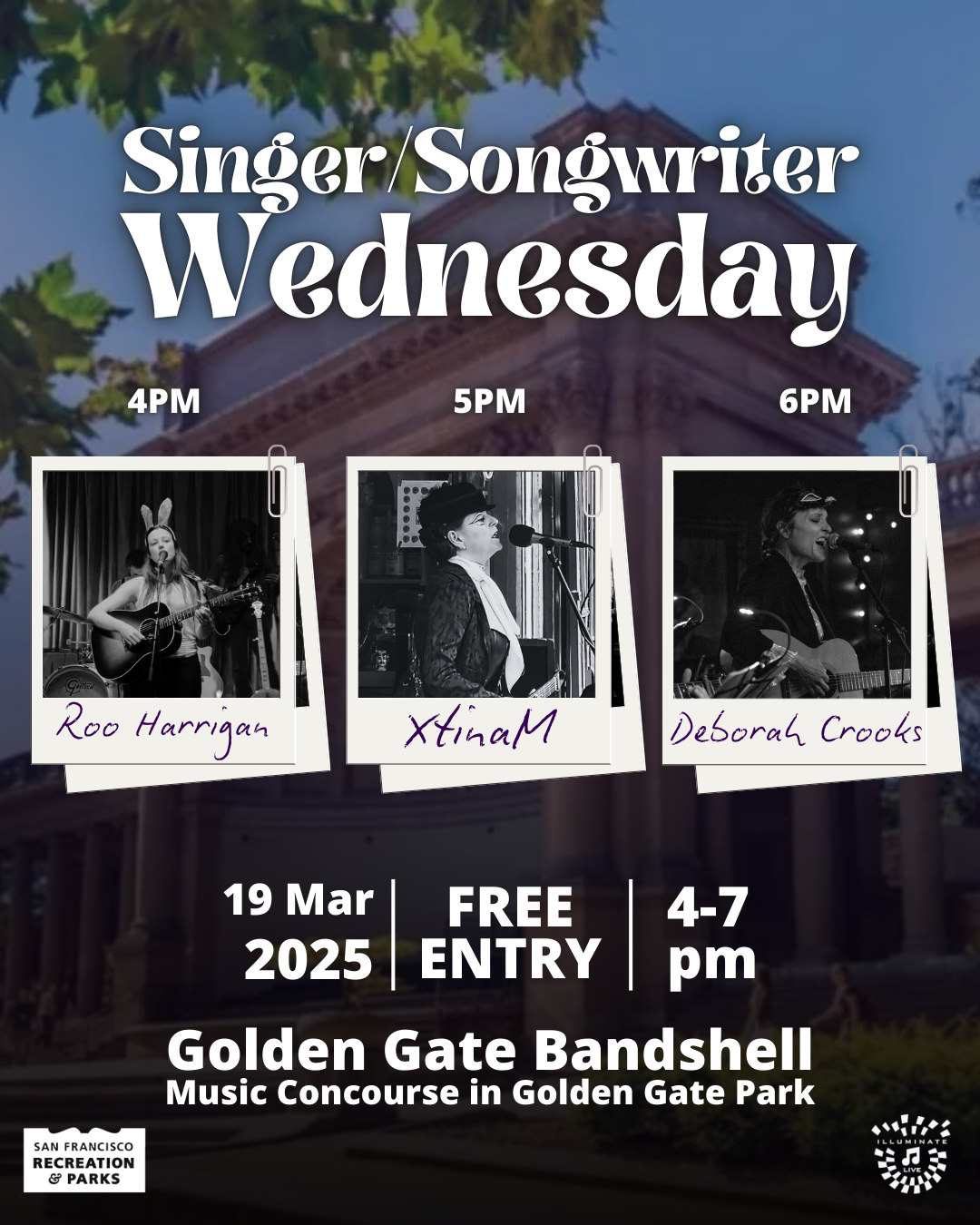 March 19, 2025In celebration of Women’s History Month, the Bandshell is featuring women & women fronted bands all month long! Pack some snacks, your favorite drinks, and grab your friends! It’s time to take a mid-week musical break and enjoy free live music from local San Francisco musicians. Set Times: 4:00 – Roo Harrigan5:00 – XtinaM6:00 – […]