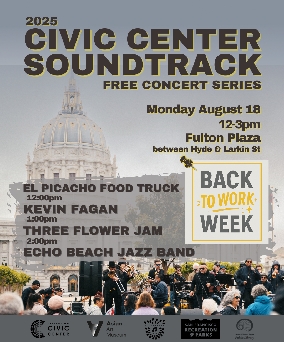 12:00 pm – 3:00 pmIt’s Back to Work Week and we’re celebrating with a special Monday edition of the Civic Center Soundtrack free concert series! Take a long lunch and enjoy free live local music in downtown San Francisco, and delicious food from El Picacho Food Truck!