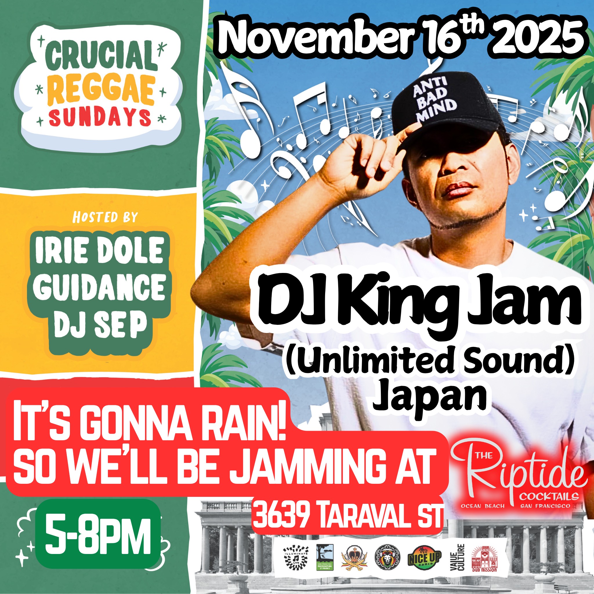 Due to weather, Crucial Reggae Sundays will move indoors to The Riptide, 5-8pm.