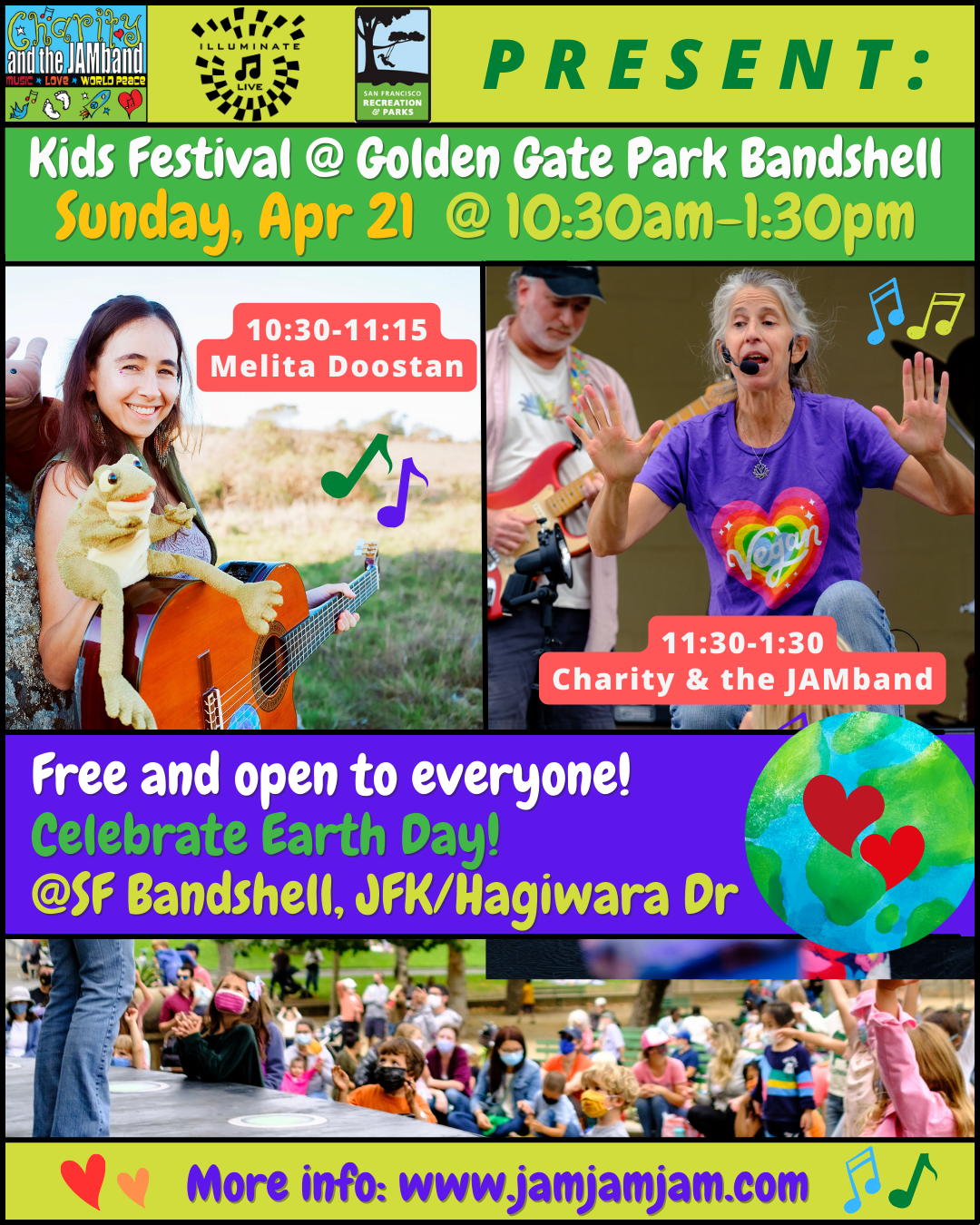 Come rock your socks off with the SF-born-and-raised family music jams of Charity and the JAMband! Renowned for their funky and unforgettable grooves, joy-filled singalongs, peace-inspired rock epics, and heart opening love anthems, all CJB songs also have accompanying dance moves for those who like to jump right in and tear it up. Featuring lyrics that talk up to kids, magical and interactive story play, and spontaneous humor, CJB shows are a rocking celebration of joining together as one family, united by song, dance and love. In addition to performing live all around the Bay for thousands of happy families over the years, CJB has released eight award-winning albums of family music. Bandleader Charity Kahn also offers music+dance+mindfulness classes and birthday parties for kids aged birth-10, with the music of Charity and the JAMband as the soundtrack, and leads meditation and qigong classes and retreats for grown-ups. Find our music anywhere you stream. For more info, visit www.jamjamjam.com.