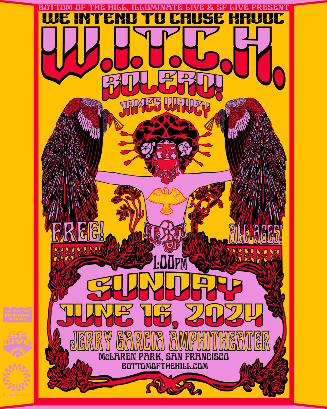 Rally your crew and join us for an unforgettable night as we bring you an epic lineup featuring the legendary WITCH (We Intend To Cause Havoc), the iconic Zamrock band from the 1970s known for their explosive blend of rock, disco, and Zambian traditional music. Joining them is James Wavey, a San Francisco-based producer and songwriter whose rhythmic poeticism and soulful style evoke the sounds of Sam Cooke and Curtis Mayfield. Also performing is Bolero!, a Bay Area band delivering dynamic “FREAK-FLAG-MUSIC” inspired by the late ’60s and ’70s, blending blues, jazz, soul, rock ‘n’ roll, folk, country funk, Latin, and psychedelic music.