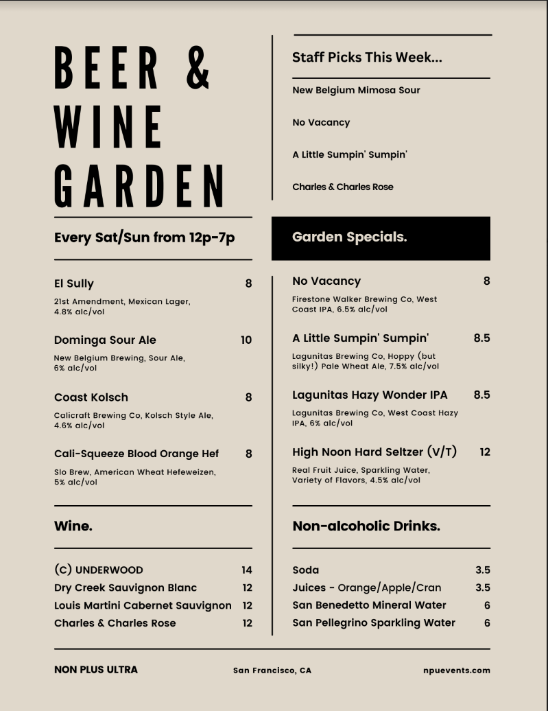12:00 pm – 7:00 pmThe Golden Mile Beer & Wine Garden is open every Saturday & Sunday from 12pm-7pm.